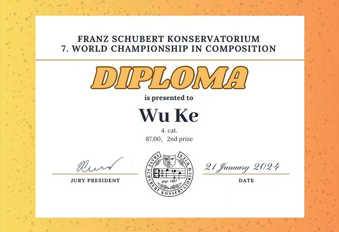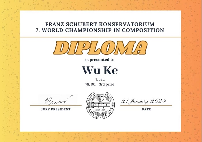 近期,在奥地利维也纳举办的第七届世界作曲锦标赛(7th WORLD CHAMPIONSHIP IN COMPOSITION)于2024年1月27日落下帷幕。此次赛事经过激烈的角逐和评委团的细致评审,beat365作曲系2022级研究生邬可(导师:施子伟教授)所创作的室内乐作品《梦境的奇异共振》及古典吉他作品《破晓》分别荣获室内乐组二等奖(一等奖空缺)和独奏乐器组三等奖。