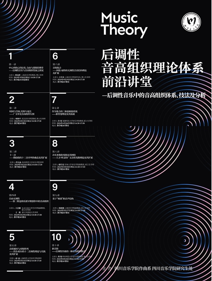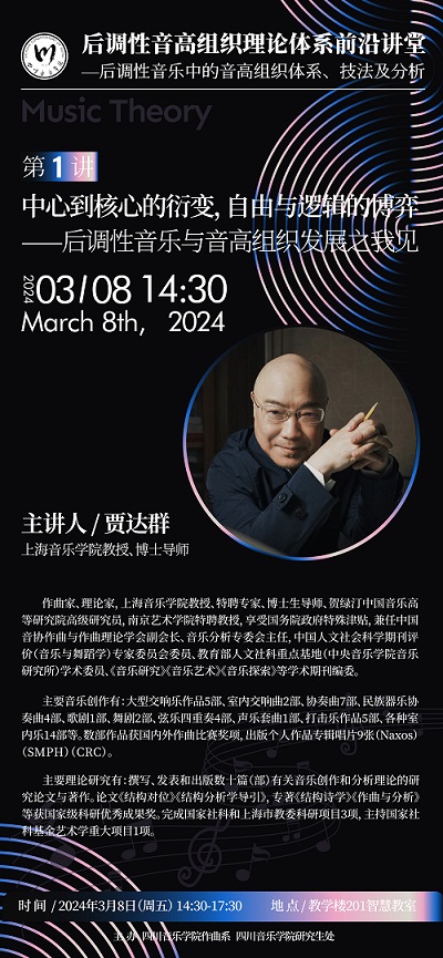 该讲座将从后调性音乐的音高组织、作曲技法、相关理论及实践等方向,聚焦后调性音乐中各理论体系的发展与理论扩展情况,以广博的视角对后调性音乐中诸多核心理论的研究现状进行梳理及论述。