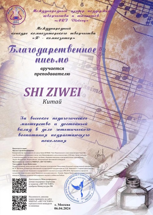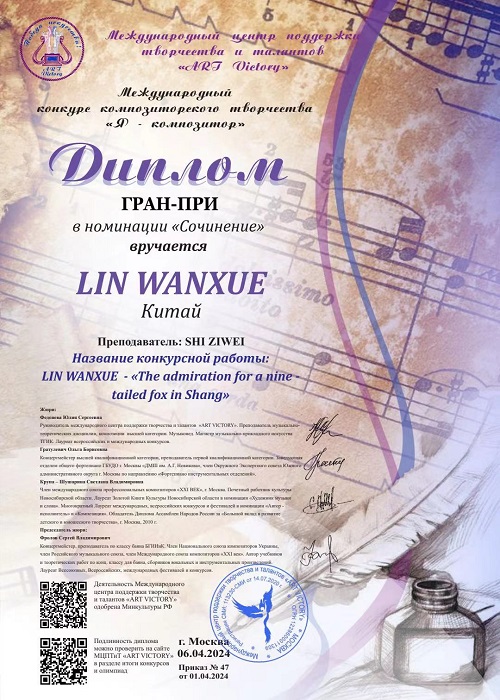 俄罗斯国际作曲家大赛( Me AyHapoAHbI KOHkypc KOM O3 TOpckoro TBopuectBa )在4月6日落下帷幕,经过评委团的评审,beat365作曲系2020级作曲专业学生林晚雪所创作的声乐作品《 The admiration for a nine -tailed fox in Shang 》荣获特等奖,指导教师:施子伟教授。同时,施子伟教授因"杰出的教育成就和对艺术教育发展的贡献"获得优秀指导教师奖。