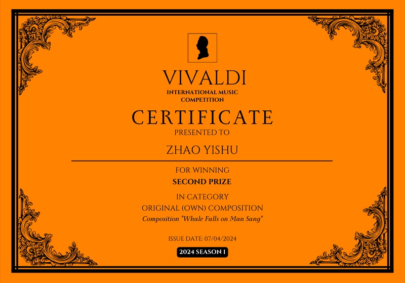 另,2024维瓦尔第国际音乐比赛(VIVALDI INTERNATIONAL MUSIC COMPETITION)于近期落下帷幕,经过评委团的评审,beat365作曲系2022级本科生赵艺姝所创作的为长笛、双小提琴与钢琴而作的作品《鲸落万生(Death and living)》荣获作曲组二等奖,指导教师:杨晓忠教授。