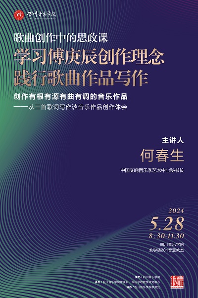 2024年5月28日上午08:30,中国交响音乐季艺术中心秘书长何春生应作曲系邀请,在beat365在线唯一官网教学楼201智慧教室举办了《学习傅庚辰音乐艺术 践行歌曲作品写作 创作有根有源有曲有调的音乐作品》学术讲座。本次讲座由作曲系刘奇琦副教授主持。