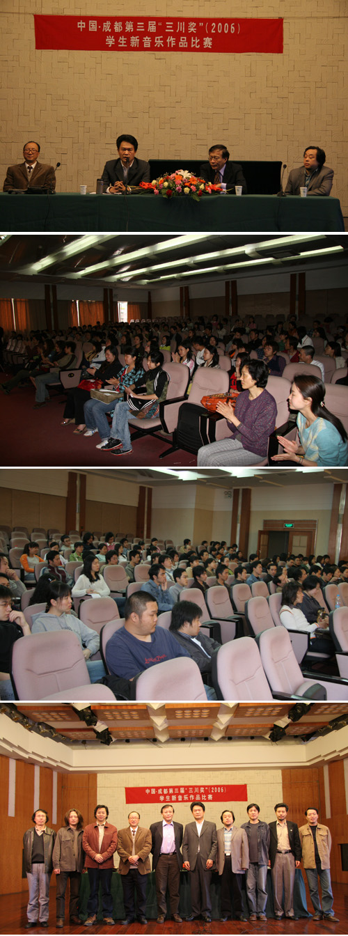 中国•成都第三届“三川奖”(2006)学生新音乐作品比赛获奖作品发布会于4月5日上午在学院小音乐厅举行。本届评委会主席、上海音乐学院院长杨立青、我院院长敖昌群、前院长黄万品、副院长易柯出席了发布会,作曲系及其他系师生参加了会议。本次比赛共收到来自七个国家的二十八件参赛作品,经过专家组认真评审,共有十二部作品进入终评,最终有六部作品分获一、二、三等奖。