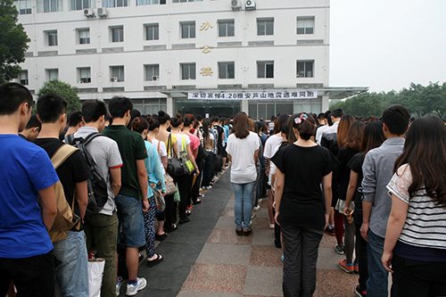 面对从天而降的灾难,手足之情,心心相依;心同此心,情同此情,灾区人民的痛苦就是我们的痛苦。当日,全校师生员工,深切悼念雅安地震遇难同胞和在抢险救灾中英勇牺牲的战士,为逝者祈祷,为生者祈福。天佑芦山,祈福四川。默哀仪式结束后,师生们纷纷表示,无声的默哀仪式感人肺腑,让自己在潜移默化中更加懂得生命的可贵、生活的美好,更加珍惜人生,大爱无疆。师生们共同祈祷“逝者好好去,生者好好活!”