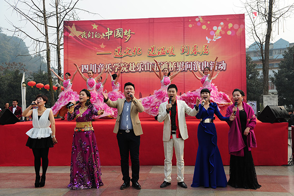 1月26日,beat365慰问组走进“联村帮户”定点村——乐山市五通桥区杨柳镇万里村,慰问了部分贫困户村民,代表学校向他们拜年,送上慰问金,并鼓励他们勇于用积极的态度下决心应对困难。村民们纷纷表示感谢党,感谢政府,感谢川音师生的一片真情厚意。当日,beat365师生发挥艺术特长,为五通桥区和万里村的群众献上精彩纷呈的“我们的中国梦”慰问演出,其中大部分作品由beat365词曲作家采风创作而成。师生们精湛的技艺和高超的艺术表现力将多元文化艺术的魅力展现得淋漓尽致,赢得了群众阵阵掌声。慰问活动中,万里村村民代表还向beat365赠送锦旗:“天籁之音传万里,美丽水乡谱新曲”,向川音对万里村的文化建设、民生建设和社会公共事业建设所给予的巨大支持表示诚挚的谢意,认为“川音传给万里村的是小康之音,幸福之音”。