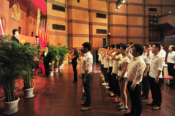 在庄严的国歌声中庆祝大会正式开始。党委副书记文云英领誓新党员宣誓。30名新党员代表站在主席台上,面对鲜红党旗,代表全校297名新党员庄严举起右手宣誓。豪迈的誓言回荡在会场,经久不息。