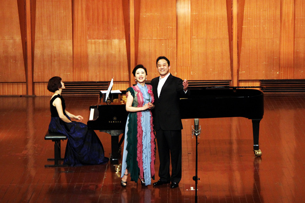 音乐会上,陈勇教授和张宁佳教授还分别演唱《你是我的快乐》、《回到幸福时刻》、《被遗弃的新嫁娘》、《让我痛苦吧》等四首外国声乐作品。音乐会最后由方琼教授和赵勇副教授合作演唱了《一对对毛眼眼照哥哥》和《一朵鲜花鲜又鲜》,精彩的演唱引得观众纷纷上台献上鲜花、掌声,欢呼声和叫好声响彻整个音乐厅,久久不能平息。