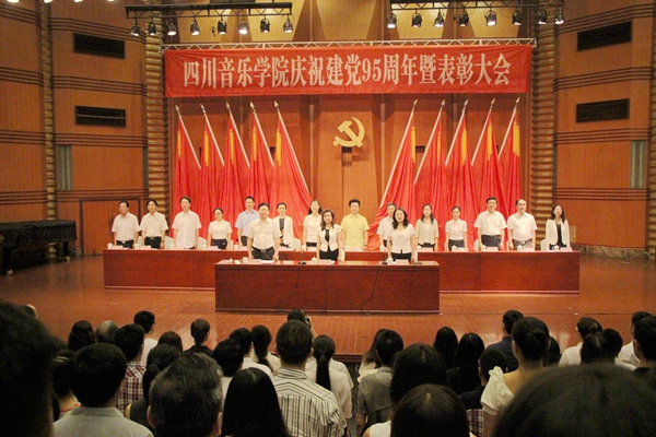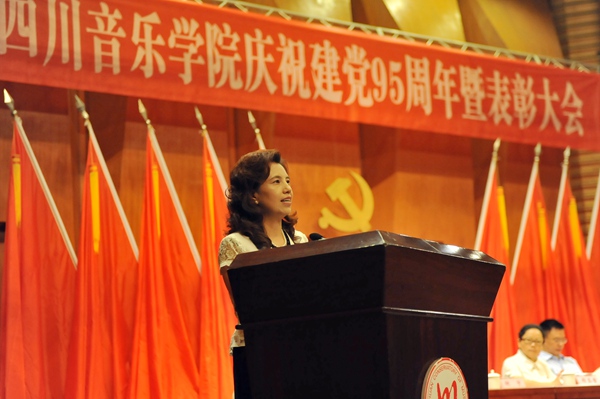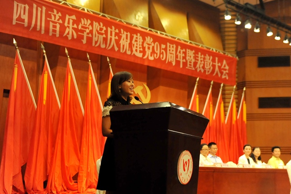 党委副书记、纪委书记文云英同志受在外出访的林戈尔书记委托,代表学校党委向全体党员师生致以节日的问候,并向受表彰的党组织和党员表示最热烈的祝贺。她说,中国共产党在95年的征程中,谱写了一部伟大的奋斗史,艰难的探索史,光辉的胜利史。在今天这个光荣而神圣的日子里,她要求我们要以川音人的身份展望未来,以共产党人的身份团结奋进:第一,学习、学习、再学习。一是学当守正。过去的一学年,在林戈尔书记、院长的带领下,学校班子和广大党员干部群众紧密团结,发挥昂扬斗志,使党建工作取得了积极进展和丰硕成果。二是学必笃实。“两学一做”,重点在学,关键在做。三是学以致用。将川音一代代传下来的好学风、正能量、好作风传承下去。第二,担当、担当、再担当。共产党人要肩负责任、敢于担当、坚守信念。一是担当要着力基层。二是担当要重在修养。三是担当要强化定力。第三,努力、努力、再努力。学校一直致力于办学发展,培养了大批优秀艺术专业人才,创作出了大批高水平的艺术作品,获得了诸多国内外重要奖项,川音在国内外享有很高的美誉度。新的起点,我们要加倍努力。一是努力坚守思想政治阵地。二是努力培养德才兼备的艺术人才。三是努力引领文艺创作导向。文云英副书记强调,川音已经进入改革发展的关键时期。去年以来,学校党委制定了“十三五”发展规划,还结合城市音乐厅建设向省上提出了三十条措施,明确了全面深度融入四川文化强省战略,积极引领助推成都音乐产业发展,做好产学研创与成果转化的川音发展新思路和新目标。各级党组织和广大党员要以表彰庆祝活动为契机,围绕中心,服务大局,团结一心,奋发有为,为实现学校“十三五”发展宏伟目标,为铸就川音振兴发展的新画卷,唱好川音好声音,讲述川音好故事。