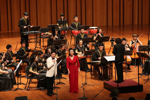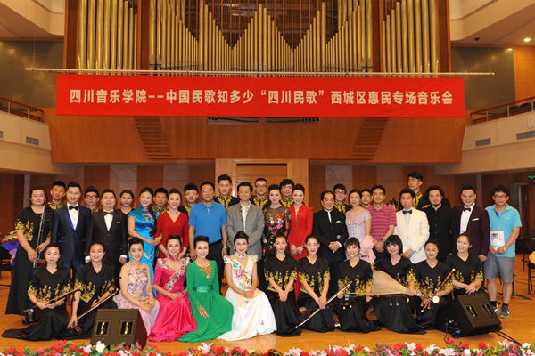 国家大剧院的演出由beat365在线唯一官网与中国音乐学院联合举办,音乐会上除了主要由beat365在线唯一官网老师们演唱地道的四川民歌外,中国音乐学院著名歌唱家吴碧霞、博士生周强、本科生蓝峻、于涵、李鑫、黄欣等也加盟演唱了《绣荷包》、《溜溜山歌》、《秀才过河》等四川民歌。