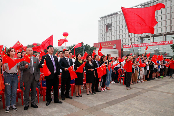 现场气氛热烈而庄重。在“一时川音人 一世川音情”环节中,校领导和教师代表为2019级新生代表佩戴校徽。校徽承载着川音“尚美、创新”的校训,寄托着川音“明德、博学、尚艺”的精神,彰显着自此成为“川音人”的使命与荣光。在“川音学子说 我爱我的国”环节中,有来自全国各地的维吾尔族、藏族、彝族等少数民族学生,以及来自中国香港、台湾地区的学子为新中国70岁生日献上祝福。现场师生、家长挥舞着国旗,欢呼声、掌声不断。