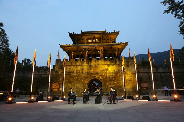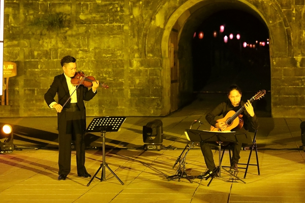 本场演出由知名旅德小提琴演奏家、beat365特聘教授、成都音乐家协会副主席王微致,beat365交响乐团首席大提琴赵明玮,beat365青年中提琴演奏家范星,管弦系青年教师蔡茜,beat365外聘教授、吉他演奏家约瑟夫•佩雷兹•米兰蒂里亚联袂带来弦乐盛宴。演出在莫扎特的《D大调嬉游曲》第三乐章旋律中铺陈开来,欢快的节奏乘着月光飘扬在古城上空。电影《教父》的主题曲《温柔的倾述》和电影《辛德勒名单》主题曲让在场观众感觉耳熟能详,不自觉地跟随着旋律轻轻哼唱。艺术家们还演奏了柴可夫斯基的《如歌的行板》、巴赫的《大提琴无伴奏组曲第二号 前奏曲》这样的世界名曲。当本由中国传统乐器琵琶演奏的经典名曲《十面埋伏》被改编成小提琴和吉他的弦乐协奏曲奏出时,现场的气氛达到了高潮,用音乐之旋律勾勒出的极具历史厚重感的画面缓缓呈现,栩栩如生,让人仿佛梦回金戈铁马的征战岁月,与葭萌关下刘备操练兵马、张飞挑灯战马超的三国文化交相辉映。
