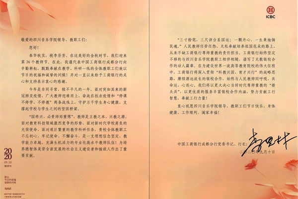 座谈会上,李思林表示,工行成都分行深入贯彻“科教兴国、育才兴行”的战略思想,将在川音设立专项奖教金、奖学金,以奖励师德厚重、成果斐然的教师,鼓舞品德优良、成绩优异的学生,全力支持川音发展。近期,双方将进一步细化专项奖金设置方案,完善工作机制,共同实现激励教师爱岗敬业、学生励志成才的积极效益,携手为党的教育事业作出新的贡献 。