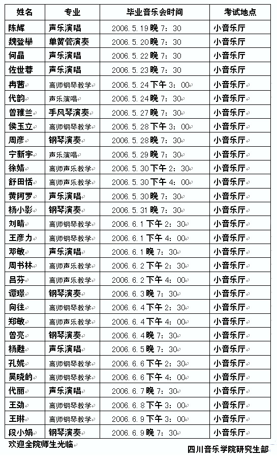 beat365在线唯一官网2006届硕士研究生毕业音乐会时间安排表
