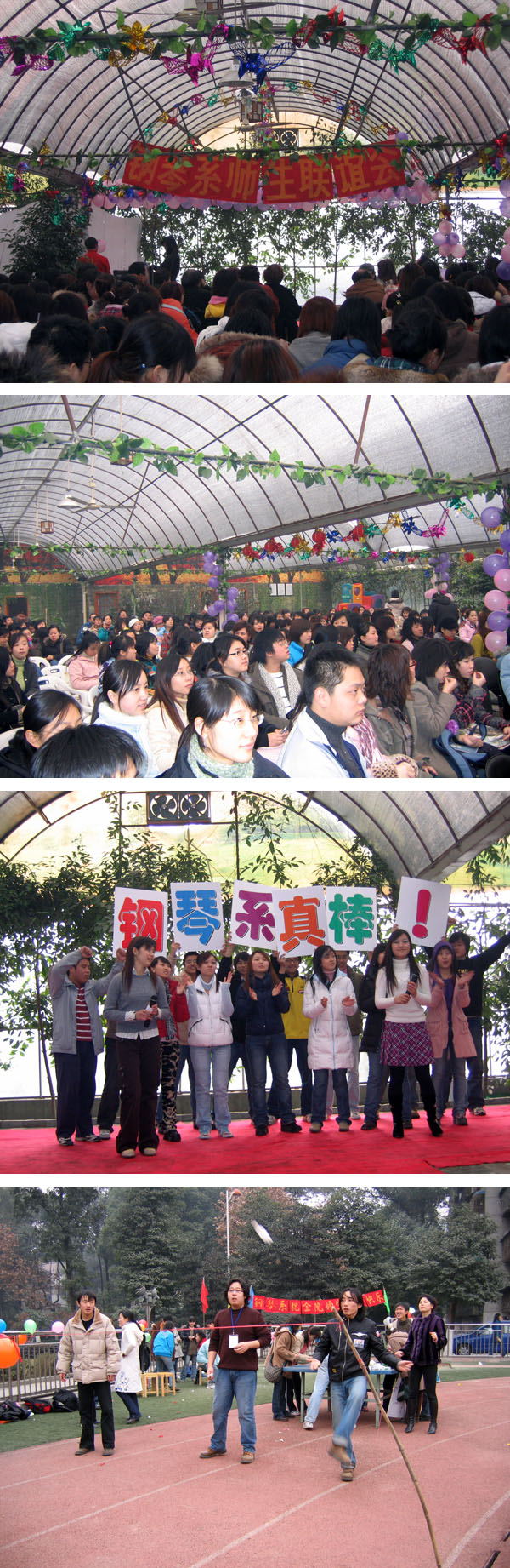 12月28日,钢琴系全体师生在南延线食圣度假村进行了一次迎新年大联欢,老师和同学共同参加游戏,同学们还精心编排了精彩的节目,有2005级新生带来的小合唱,音乐剧《同桌的你》,极具创意的时装秀,有活力四射的街舞,还有在12 .9才艺大赛中代表我系参赛并获二等奖的舞蹈《异国风情》。