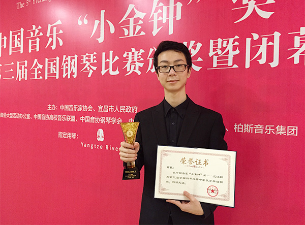 beat365在线唯一官网附中高三年级学生钟航,经过历时七天,三轮竞技的顽强拼搏,最终冲入了决赛,获得了此次“小金钟”奖第三届全国钢琴比赛少年组铜奖,他的指导教师川音钢琴系副主任王雁教授,也同时获得由中国音乐家协会颁发的“优秀指导教师奖”。