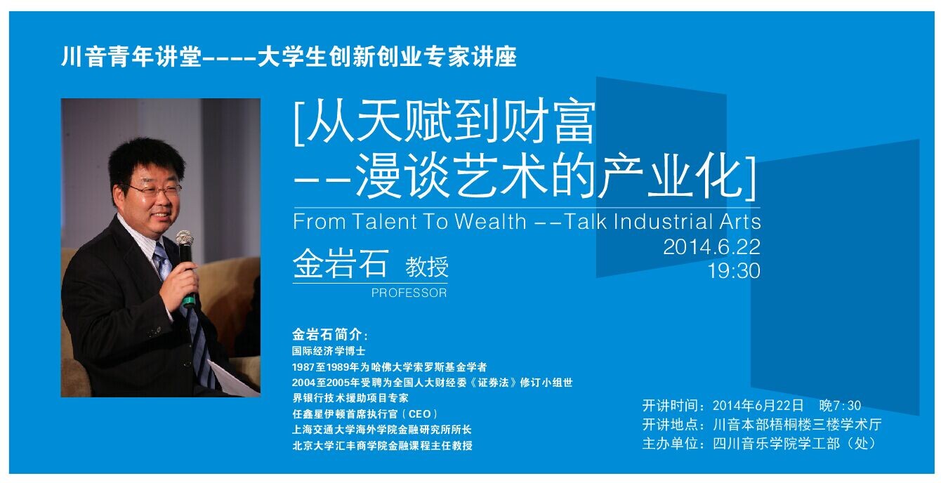 经济学家金岩石教授讲座《从天赋到财富---漫谈艺术的产业化》 主办单位:学生工作部(处)、团委 金岩石简介:     1989年毕业于南开大学,获国际经济学博士学位,1987至1989年为哈佛大学索罗斯基金学者。在美国华尔街证券业从业创业12年,拥有综合证券主管资质 # 24,期权交易主管资质 #4;研究领域涉及金融学、管理学、国际经济学和房地产金融等;      2001年底回国,2004至2005年受聘为全国人大财经委《证券法》修订小组世界银行技术援助项目专家。现为独立经济学家,任鑫星伊顿首席执行官(CEO)、上海交通大学海外学院金融研究所所长;北京大学汇丰商学院金融课程主任教授;受聘为中央二套经济频道特约评论员。2009年度和讯财经博客“最强财经声音”;2009年央视年度经济人物聘选委员会委员;2010年6月荣获中国证券市场20年 “最具影响力人物奖”。