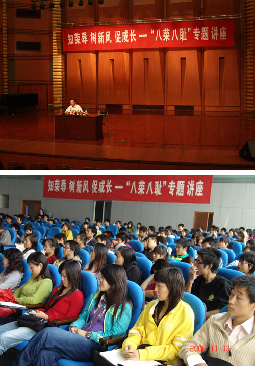 讲座阐述了“八荣八耻”提出的背景、内容及其意义,既回顾历史,又评说现实、展望未来,典型的事例深入浅出,精辟的见解发人深省,严密的逻辑叫人叹服,风趣的表达让人回味,不时赢得阵阵掌声。