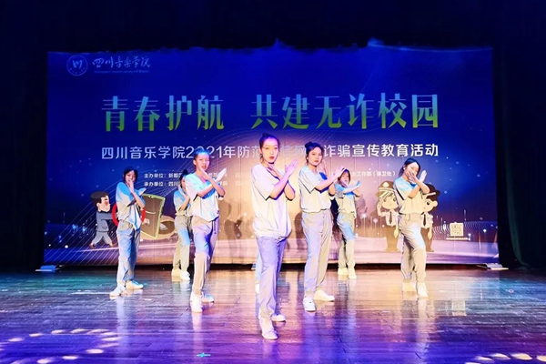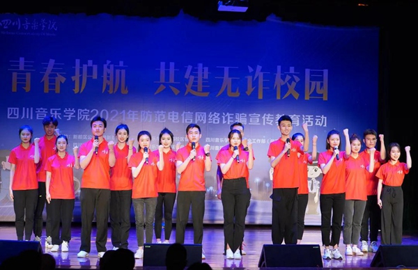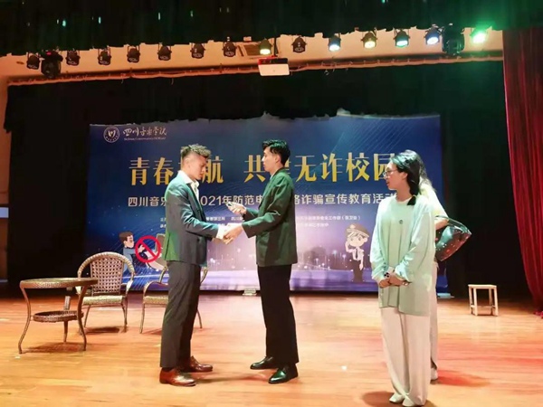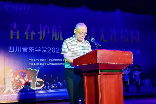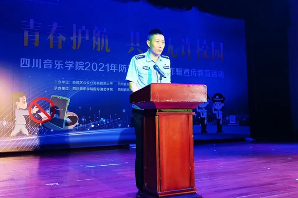近日,学校举办了2021年"青春护航·共建无诈校园”防范电信网络诈骗宣传教育活动。此次活动由新都区公安分局新都派出所、党委安全工作部(保卫处)主办,国际演艺学院、传媒学院、艺术附中承办。党委常委、副院长牟文虎出席活动,成都市公安局,成都市团委,新都区公安分局,新都派出所,西南石油大学,成都医学院和新都校区相关系(院)、部门负责人以及学生代表共240余人参加了此次活动。