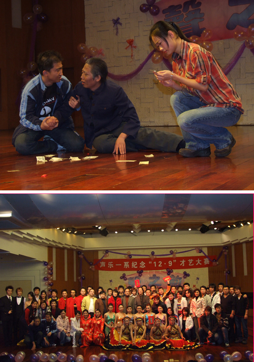 2006年11月25日下午,由院学生处、团委主办,声乐一系学生党支部、团总支、学生会承办的一台纪念“12·9”的才艺大赛在院本部小音乐厅隆重举行!同学们激情高涨,通过现代舞、双人舞、拉丁舞、小品、配乐诗朗诵、音乐剧、歌曲联唱、荒诞剧等多种节目形式纷纷展示了自己的才艺,也通过对文本的编剧,节目的策划,舞台的设计等展现了自己各方面的能力。台上演员与台下观众激情互动,使得演出不断达到新的高潮。由我系学生自编自导自演的音乐剧《晴天的雾》上演了当代贫困大学生上大学的感人一幕,不时博得台下阵阵掌声;歌伴舞《七月的火把节》气氛欢快热烈,为演出划上了一个圆满的句号!最后,由我系老师和6位大众评审组成的评审团评出了本次大赛的一等奖:荒诞剧《大话英雄》。
