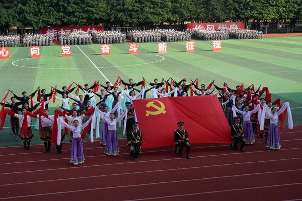 结业典礼在激昂的《中国人民解放军进行曲》中正式拉开帷幕。各系(院)的方队依次走过主席台接受检阅,他们昂首挺胸、英姿飒爽、神采奕奕,每一声响亮口号,每一次昂首阔步,都展示了川音青年昂扬向上的精神风貌。军事训练成果汇报表演中,参训学生们还展示了匕首操、刺杀操、军体拳、战术综合演练等,整齐划一的动作淋漓尽致地展现了军训14天以来的训练成果。其中,“红心向党”摆字方阵中,川音青年带着青春的朝气,用整齐划一的动作组成旗语活字方阵,变化出“1921”、“2021”、“100”、“中国共产党万岁”、“请党放心,强国有我”、“党徽”的图案和字体,为建党100周年献上最真挚的祝福。