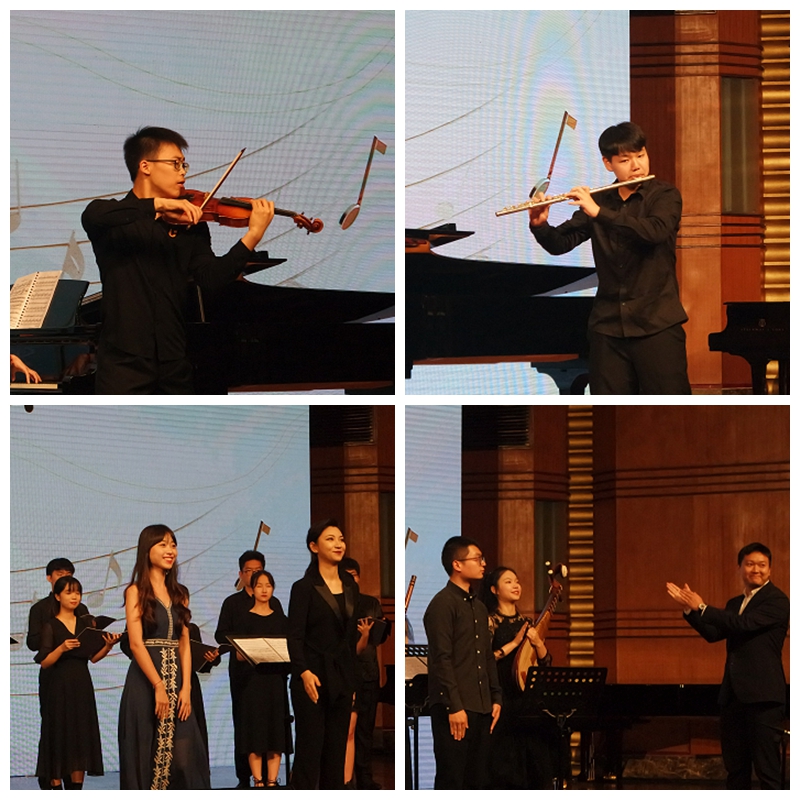 音乐会结束后,学院领导,相关部门、教学单位负责人,指导老师、参演学生在台上合影留念。