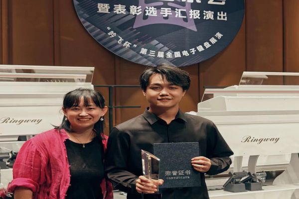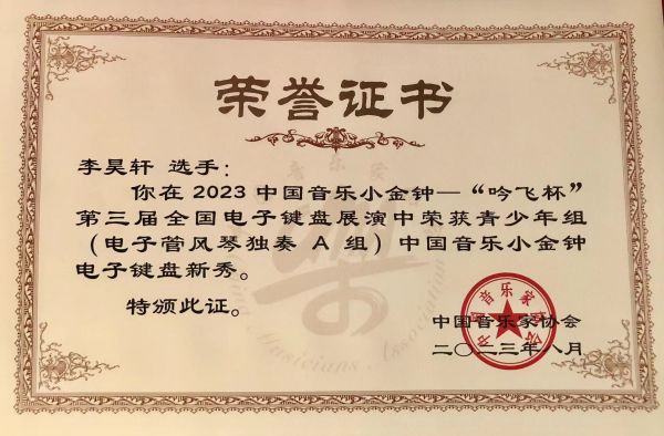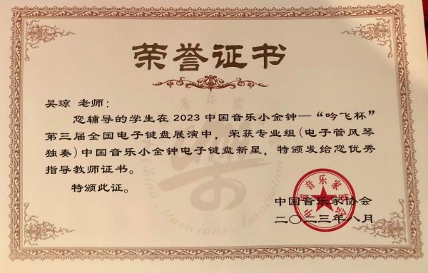 手风琴与现代器乐系师生在此次比赛中发挥出色,经过与全国各地顶尖选手的激烈角逐,喜获佳绩:研究生三年级学生林博宇荣获专业组(电子管风琴独奏)中国音乐小金钟电子键盘新星奖(指导教师:吴琼教授),林博宇同学在本次比赛中凭借出色的发挥和优异的表现获得了专家评委一致好评!以总成绩排名第二,荣获电子键盘最高奖——电子键盘新星奖,同时吴琼教授荣获优秀指导教师奖。本科一年级学生邹志豪荣获专业组(电子管风琴独奏)以总成绩排名第五,荣获中国音乐小金钟电子键盘新秀奖(指导教师:王茜副教授)。附中高三学生江韵秋荣获专业组(电子管风琴独奏)中国音乐小金钟电子键盘新人奖(指导教师:张晓波教授)。外聘教师李林俊指导的学生叶天宇以总成绩排名第一,荣获青少年组(电子管风琴独奏A组)中国音乐小金钟电子键盘新星奖(代表四川音乐家协会参赛),李林俊老师也荣获优秀指导教师奖:吴琼教授指导的学生李昊轩,以总成绩排名第五,获青少年组(电子管风琴独奏A组)中国音乐小金钟电子键盘新秀奖(代表四川音乐家协会参赛)。