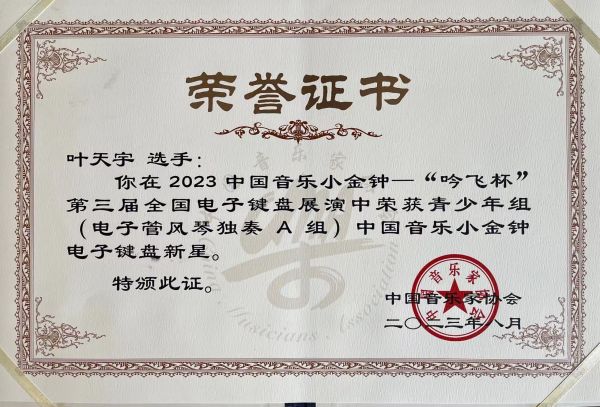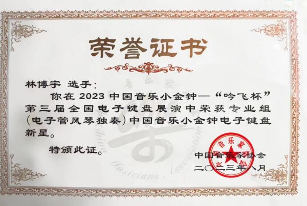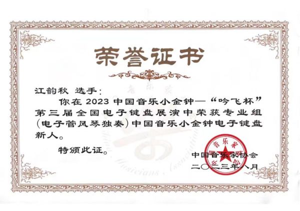 2023中国音乐小金钟——吟飞杯第三届全国电子键盘展演是由中国音乐家协会、中共常州市委宣传部主办,中国音乐家协会电子键盘学会、江苏省音乐家协会、中共常州市新北区委宣传统战部、吟飞科技共同承办的全国性电子键盘展演,展演于2023年8月22日至26日期间在江苏常州举行。专家委员会由国内知名演奏家和著名专家、教授、教育家等组成。中国音乐小金钟电子键盘展演是中国音乐家协会举办的重要活动之一,也是电子键盘在中国的顶尖展演赛事。展演的设立旨在促进我国电子键盘音乐事业的发展,进一步普及电子键盘音乐教育,为广大优秀的专业、业余选手提供一个音乐交流和展示的平台,为我国电子键盘演奏、创作领域选拔一批优秀的后备人才。本次中国音乐小金钟电子键盘展演来自全国的270余名优秀选手及全国11大音乐学院优秀选手进行激烈角逐。其中专业组展演赛事设有:最高奖——电子键盘新星三名、二等奖——电子键盘新秀九名、入围奖——电子键盘新人12名。