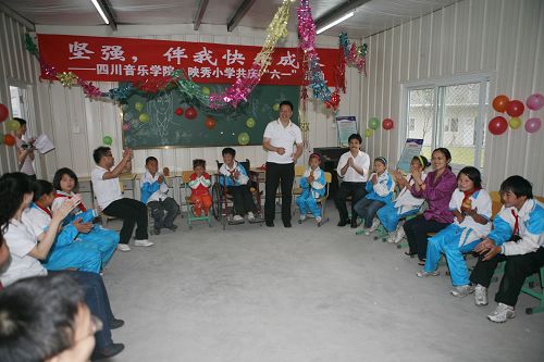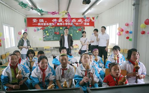 在汶川映秀,由党办、宣传部、音乐学系和四名下派到汶川的挂职干部,与小朋友们一起摆故事、做游戏、吹乐曲、赠汗衫,操场外、教室内听到了久违的笑声、歌声。为灾区的孩子们过了一个又难忘的灾后第一个儿童节。
