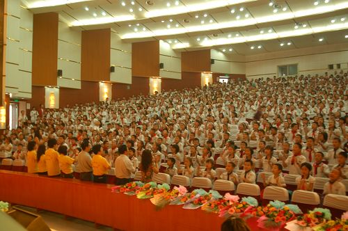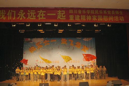 在什邡,慰问团的第一站来到了什邡方亭班房小学,全体党员师生在方亭板房小学校长的带领下走进校区。什邡市方亭板房小学,是由什邡实验小学、什邡市方亭二小、方亭四小三所学校临时组合而成,有18栋板房,教师200余人,一次性可容纳4800余名学生就读。这里的孩子年龄最小的4岁,最大的只有12岁。校园干净整洁,每个教室的班级文化建设、教室外面的展示牌一应俱全,规范美观;孩子们活泼快乐,老师们精神振奋,校长热情睿智,学校井然有序,生机勃勃。演出在1200余名灾区小朋友们欢快的童声齐唱中拉开了序幕,他们的歌声饱满热情,天真可爱,伴着孩子们的歌声,民乐系师生响起了喝采的掌声。随后小朋友们表演了开场舞《欢天喜地庆“六一 ”》。