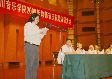 获得多项国际、国内大奖的教师代表陈军教授发言,他说,川音经过历代师生员工的多年努力奋斗,取得了包括评建工作获得优秀学校和重大科技奖在内的丰硕成果。现在又站在了新的台阶,提出了新的奋斗目标,作为教师,我们感到非常自豪。在未来的工作中,将在科学发展观的指导下,精于务教,努力培养更多更好的艺术人才,为学院的发展,为祖国的教育事业作出更大的贡献。