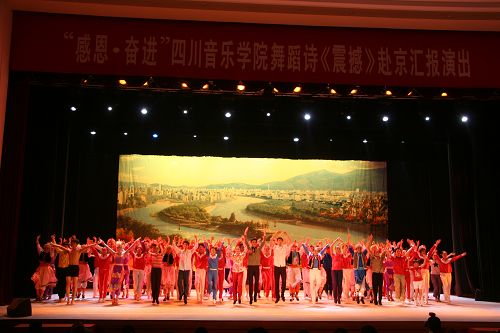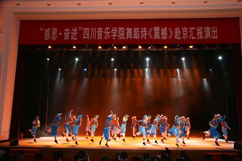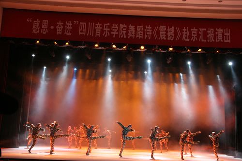 大型舞蹈诗《震撼》以“5.12”大地震为题材,多角度,多侧面地撷取真实生活中的“经典场景”,通过不同的艺术手段和表现方式,生动地刻画人物、深情地描写感情、深刻地挖掘人性,真诚地表现了人在灾难面前的生死观、道德观、爱情观和价值观,塑造出令人难忘的群体形象,充分展示了中华民族的伟大品格和精神,展示了人性的光辉。全剧由11个段落加一个“序”,一个“尾声”构成,总长度约70分钟。舞蹈教育家李炜副教授为艺术总监,国家一级编导李楠为编舞、舞蹈教育家白莉为排演总监。表演阵容由beat365在线唯一官网舞蹈团100余名师生组成。技艺精湛,表演真实,感情充沛。