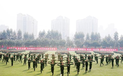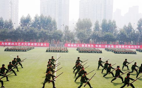 分列式汇报,在军旗的带领下,各个方队依次通过主席台,同学们步履矫健、斗志昂扬,口号整齐有力,展现出新一代大学生奋发向上的飒爽英姿。分列式结束,进行了军体拳、韵律操、刺杀操、战术表演、棍术、倒功、擒敌术、硬气功和解救人质等表演。整齐的步伐、响亮的口号、规范的动作、机敏的身手、昂扬的斗志赢得了阵阵掌声。学子们把艺术的气质和军人的斗志完美融合,充分展示了川音学子的独特风采与魅力。