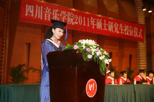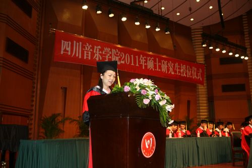 优秀硕士毕业生代表周薇薇发言。她激情满怀的诉说了对恩师的不舍、对青青校园的眷恋、对过去经历的这不平凡三年的感慨万千。作为一名川音人,将带着川音的光荣与梦想,带着“乐于奉献、勇于展示”的川音精神不断前行。