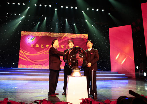在热烈的掌声中,中国文联名誉主席、中华人民共和国文化部原代部长周巍峙宣布“文化艺术院校奖——第四届全国青少年民族乐器演奏比赛”开幕,我院院长易柯、文化部民族民间文艺发展中心主任李松、西南民族大学校长赵心愚一同启动水晶球。